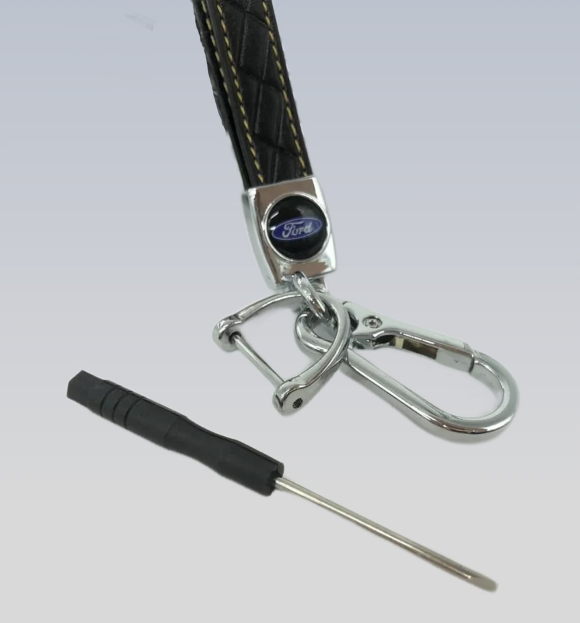 Ремешок выполнен из экокожи. Крепление изготовлено из высококачественного цинкового сплава и состоит из двух карабинов, вращающихся на 360 градусов. Карабины надёжно закрываются, один из которых имеет резьбовое соединение и к нему в комплекте идет маленькая отвёртка.