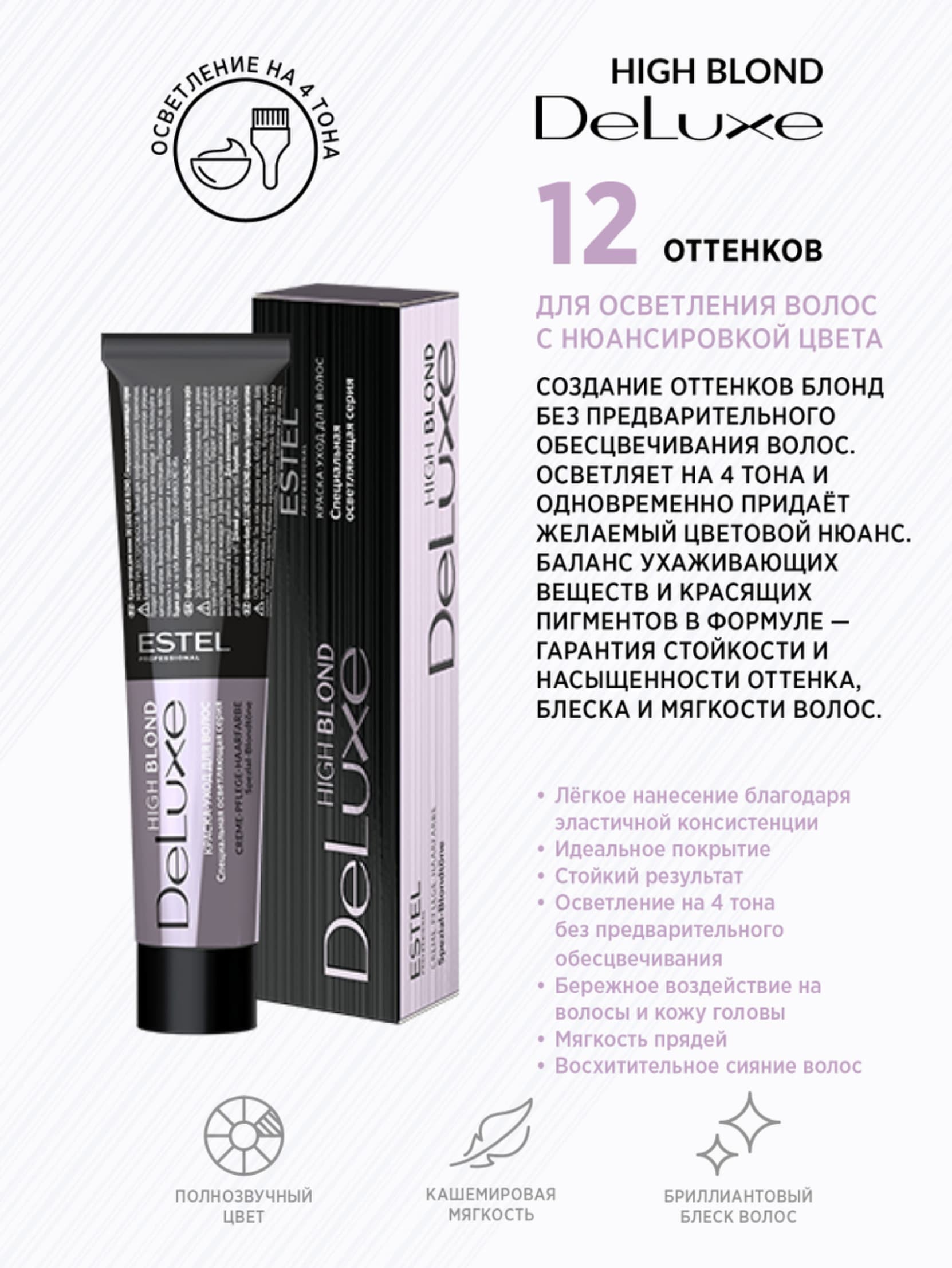 Крем-краска DeLuxe обеспечивает эффективный уход за волосами в процессе окрашивания благодаря уникальному хромоэнергетическому комплексу с хитозаном, входящим в ее состав. Продукт обладает мягкой и эластичной текстурой, легко и экономно наносится на пряди. Обеспечивает 100%-ное закрашивание седины.