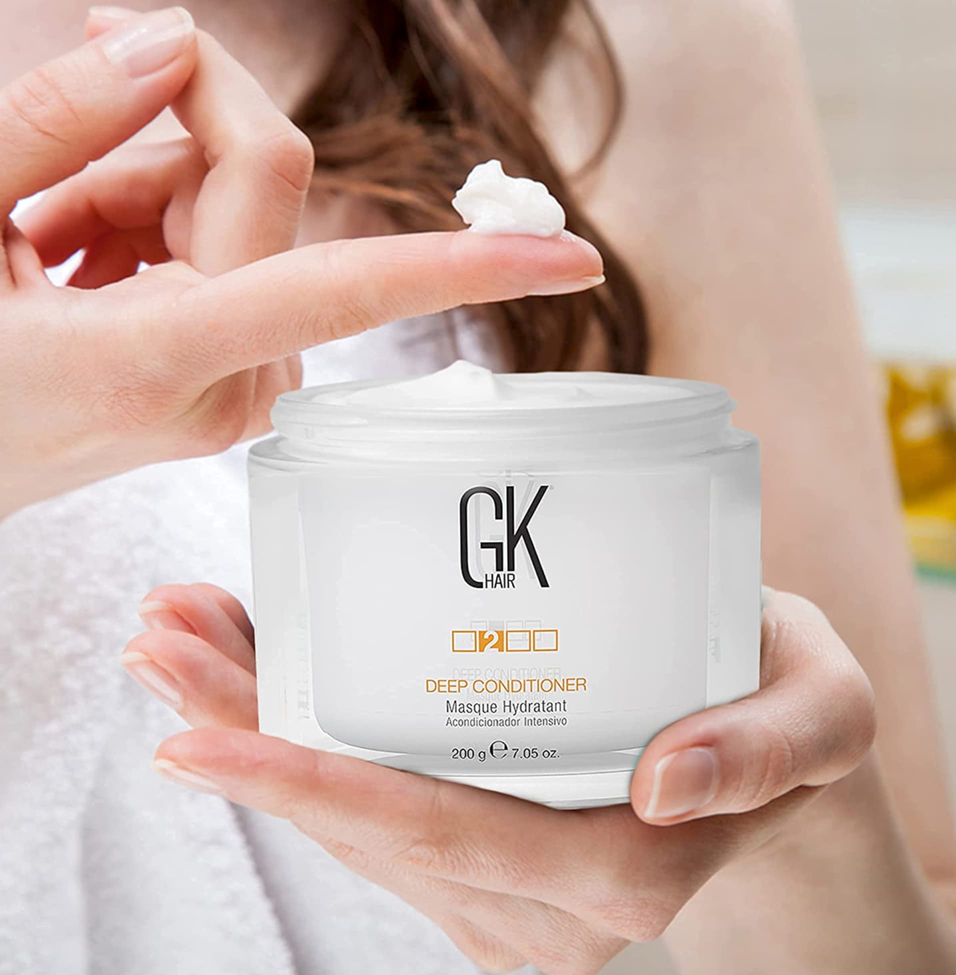 Вымойте волосы шампунем по типу волос бренда GKhair 1-2 раза и промокните их полотенцем. Нанесите маску на влажные волосы, равномерно распределите, наденьте полиэтиленовую шапочку и оставьте на 10-15 минут (для более интенсивного результата рекомендуется использовать тепло). Тщательно промойте волосы теплой водой. При необходимости выполните укладку.